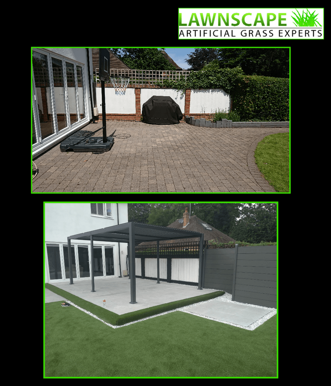 Lawnscape were tasked to completely replace the existing lawn, block paving and fencing, as well as adding a raised platform for a pergola installation.