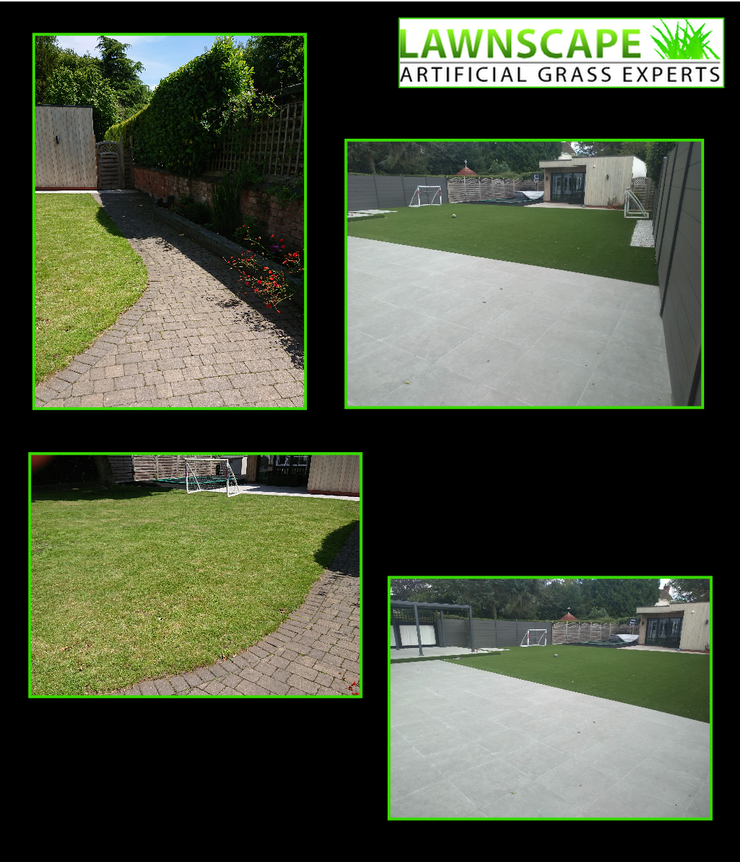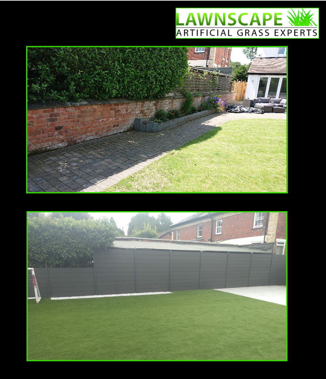 This was achieved with a combination of premium Lawnscape artificial grass, porcelain slabs (a lot!), decorative edging stones and composite fence panels.