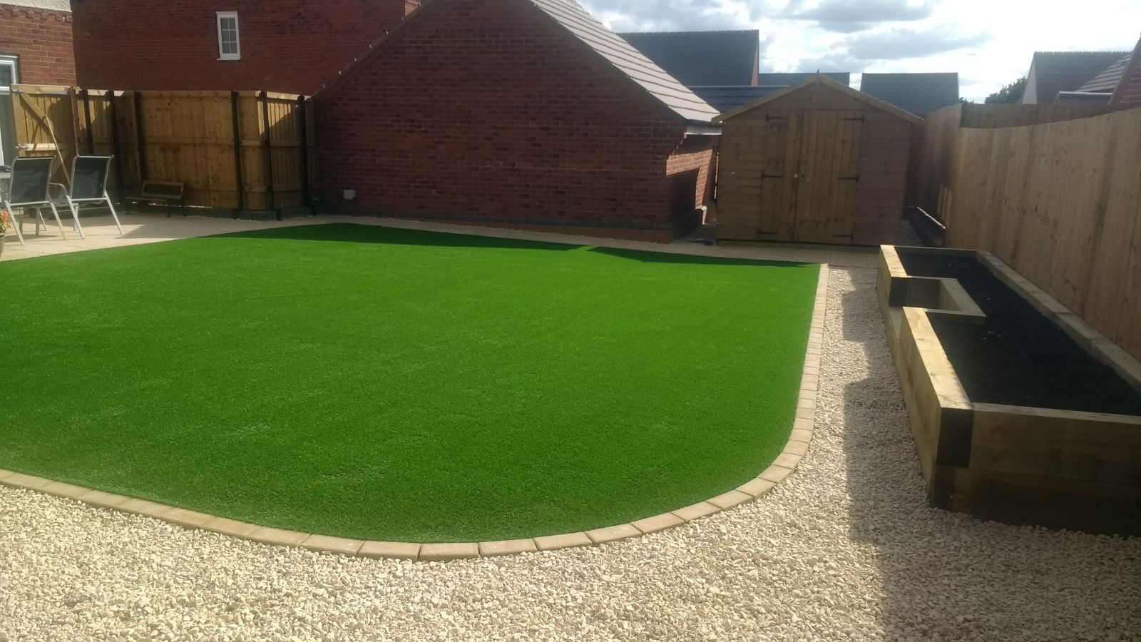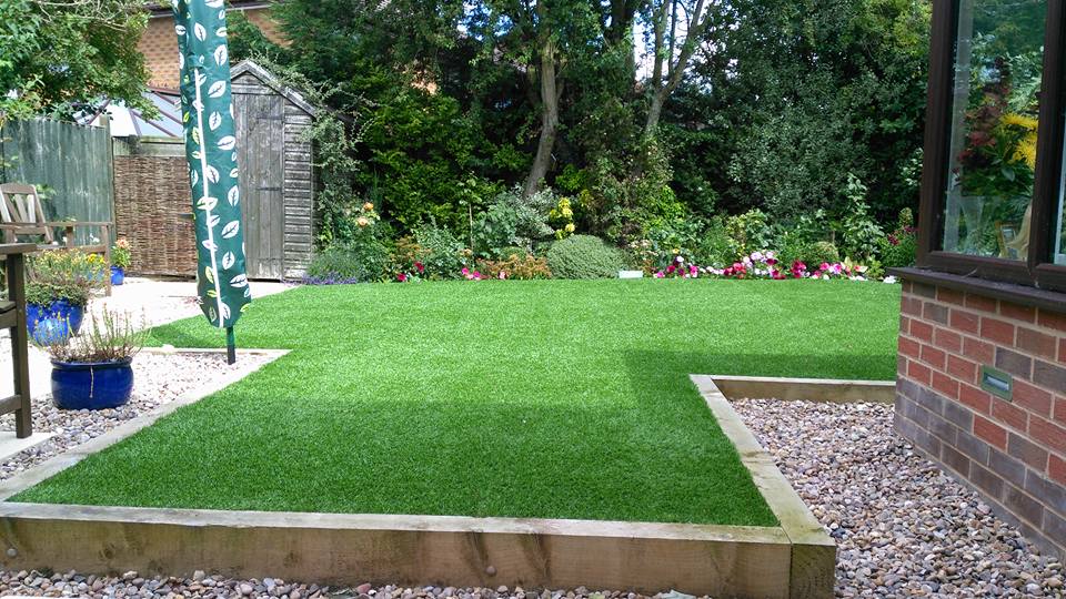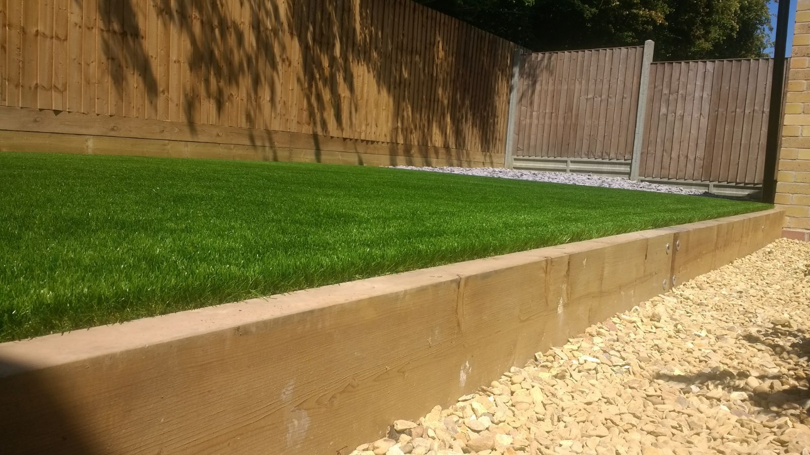 On this project, sleepers were used for the raised artificial lawn and borders were filled with decorative stone.